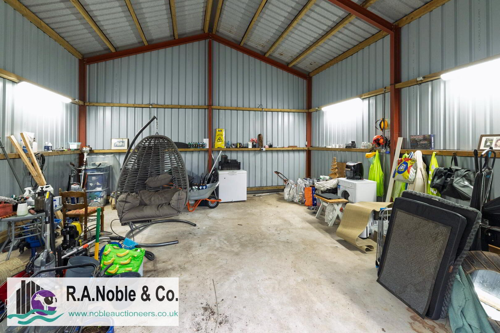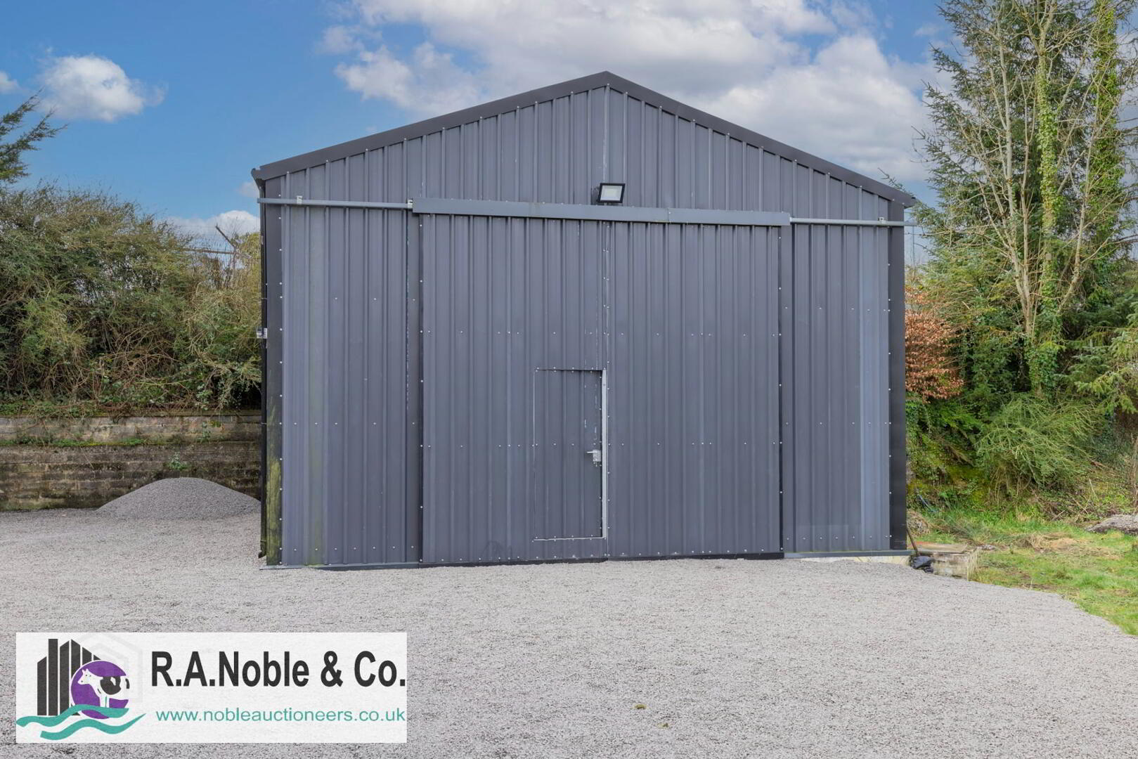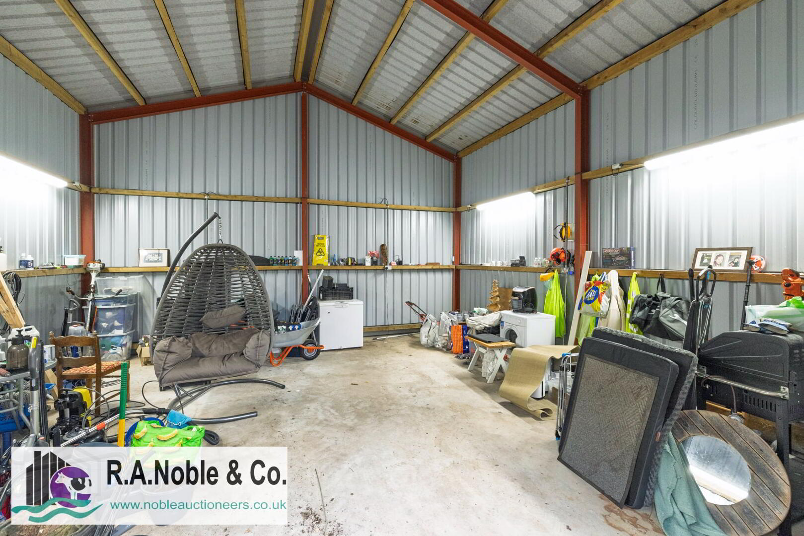 A large steel portal framed shed measuring approximately 7m x 7m with a ridge height of 5.3m features an insulated roof and electric supply, offering excellent potential for storage, workshop use or hobby space.