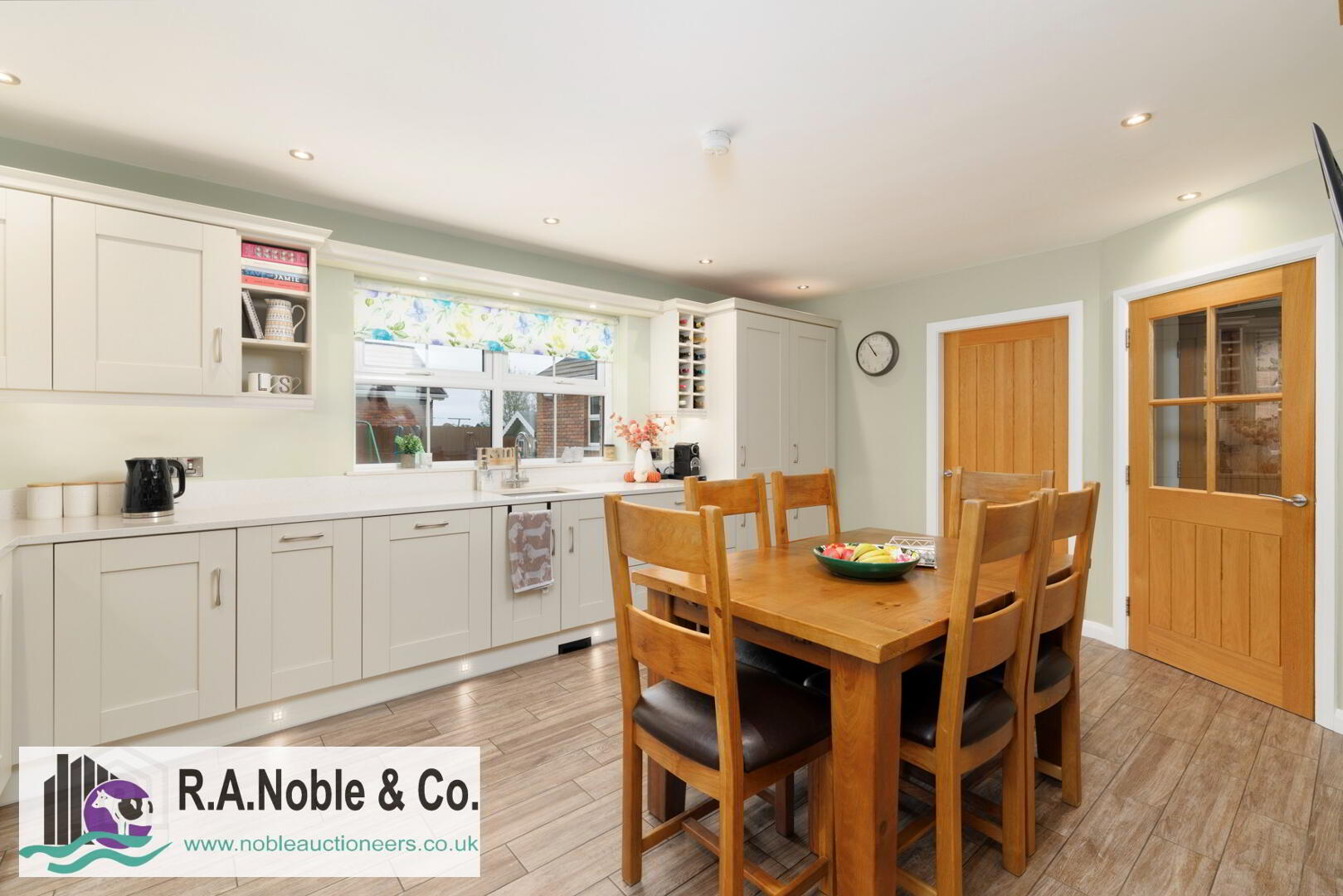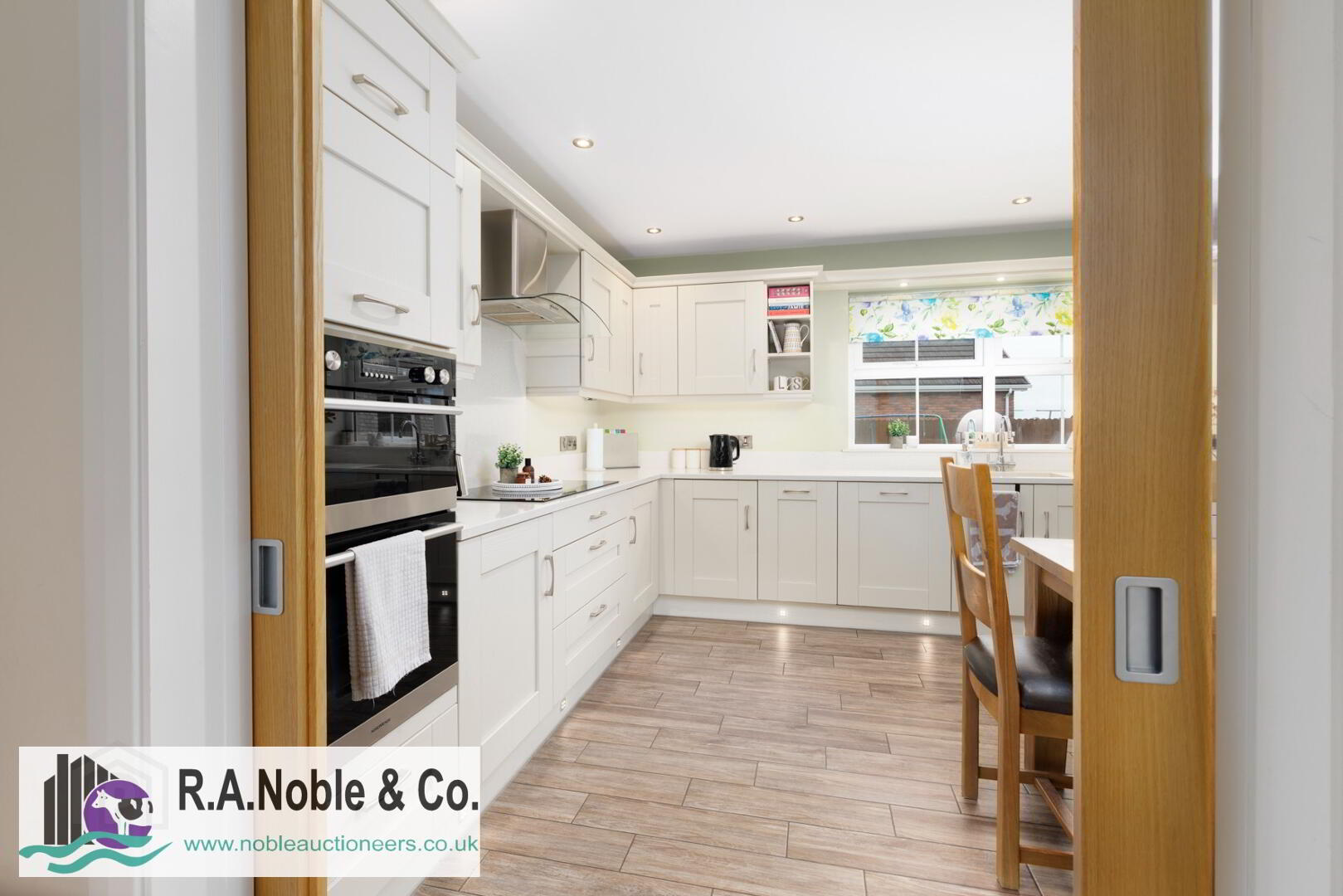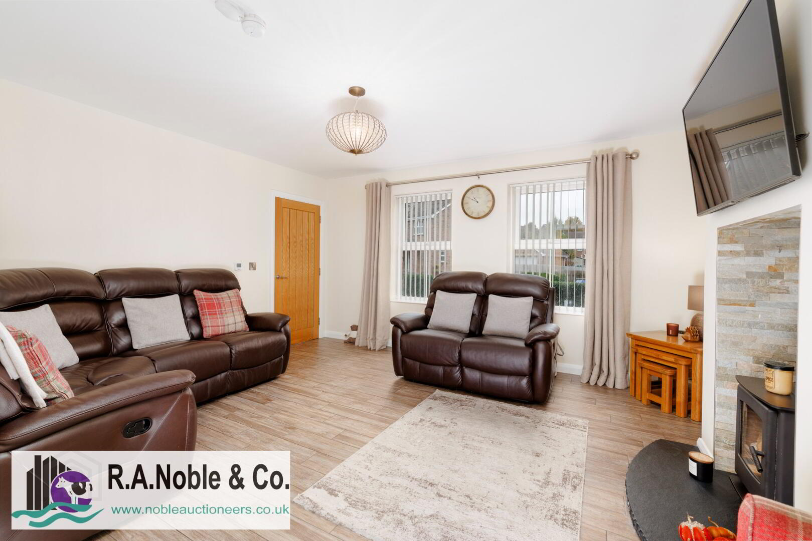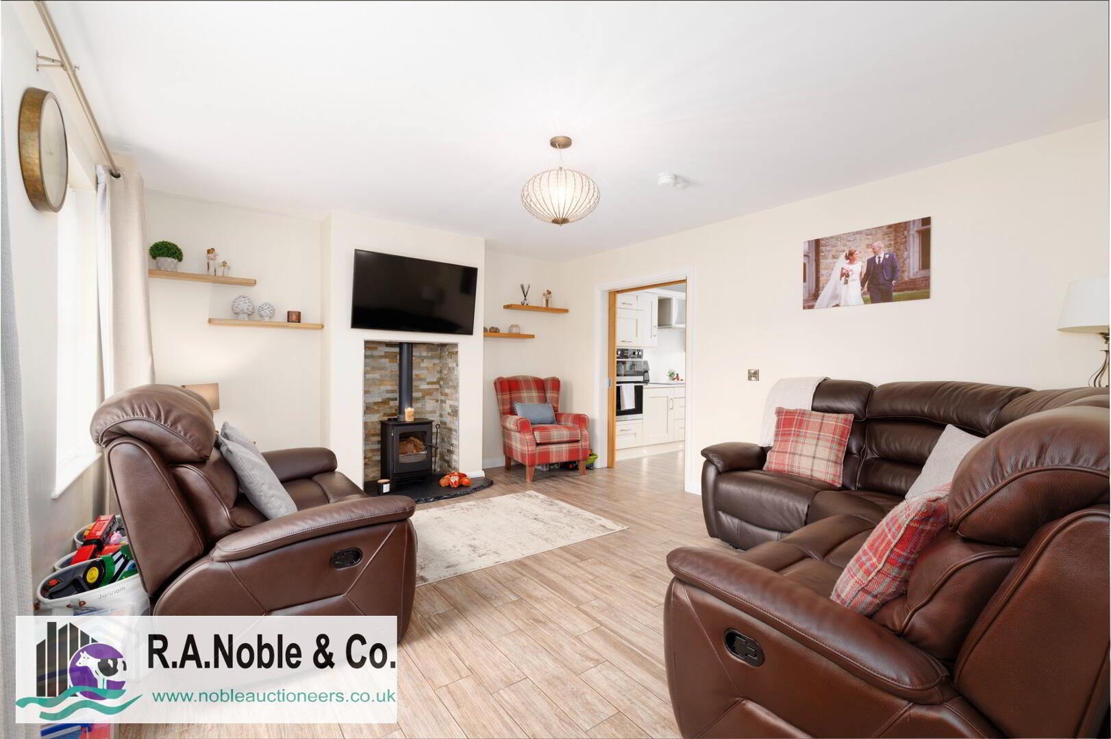 Inside the welcoming living room features a charming solid fuel burning stove set on a slate hearth and stone effect tile surround, creating a cosy focal point. A sliding door opens into the spacious contemporary kitchen, which truly stands out with its quartz worktops, integrated appliances, double oven, induction hob, and ceramic tile flooring.