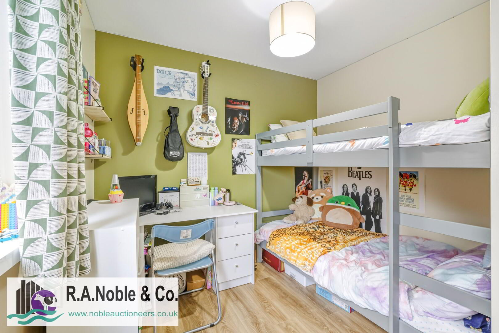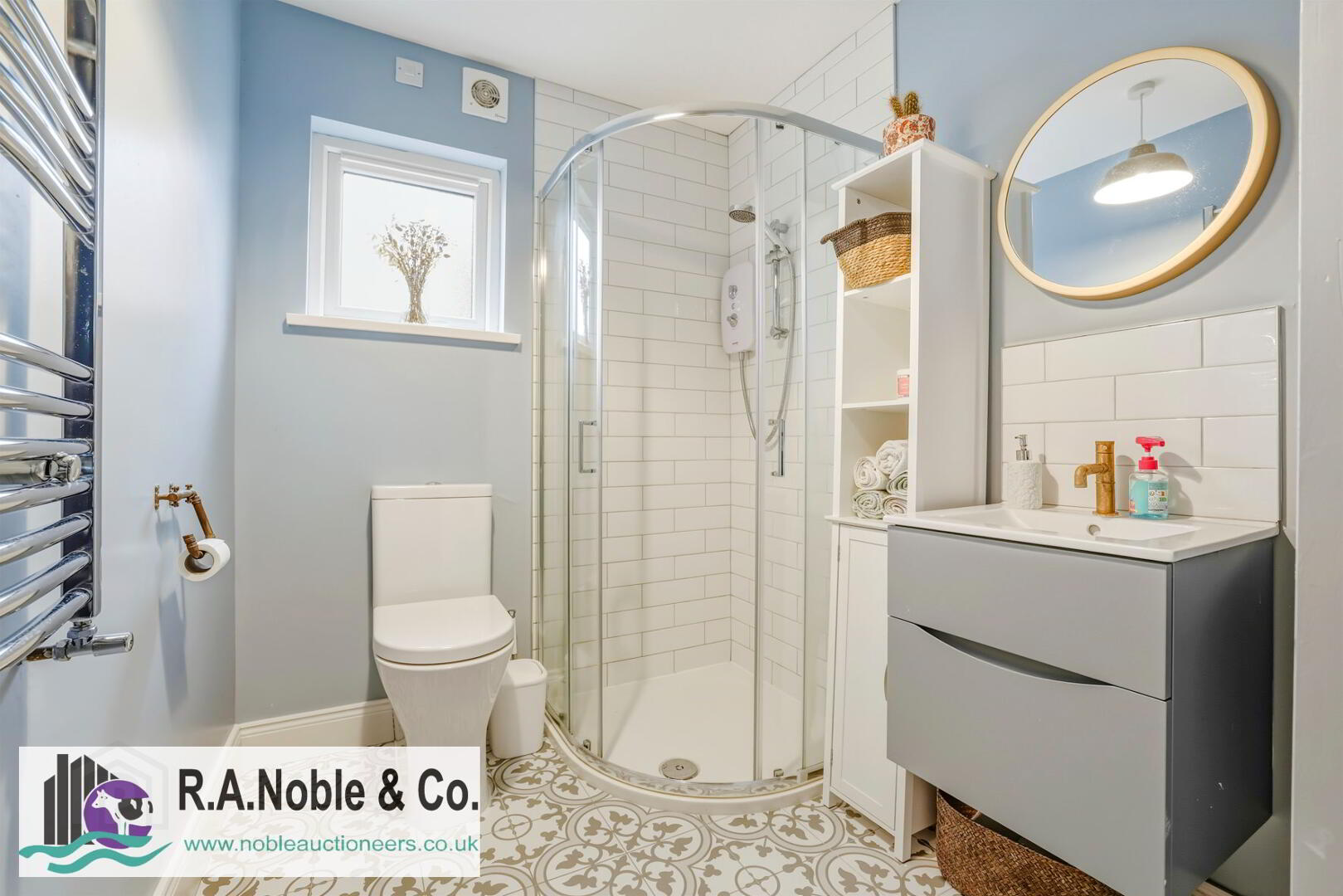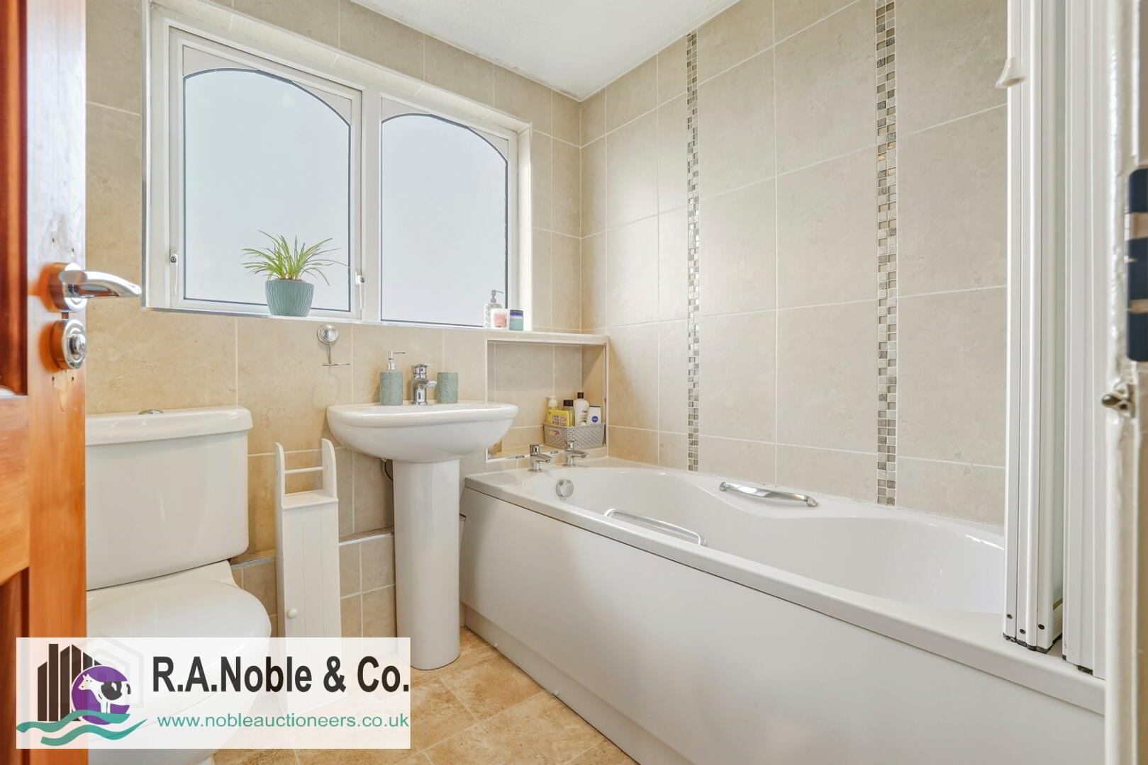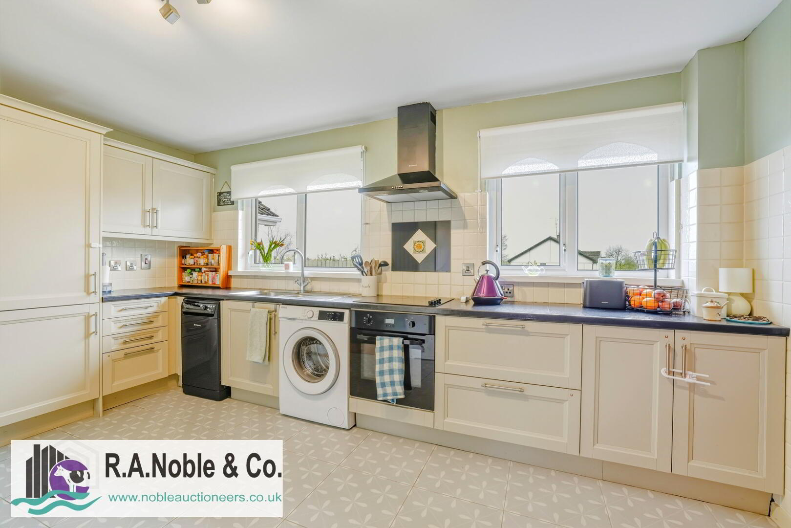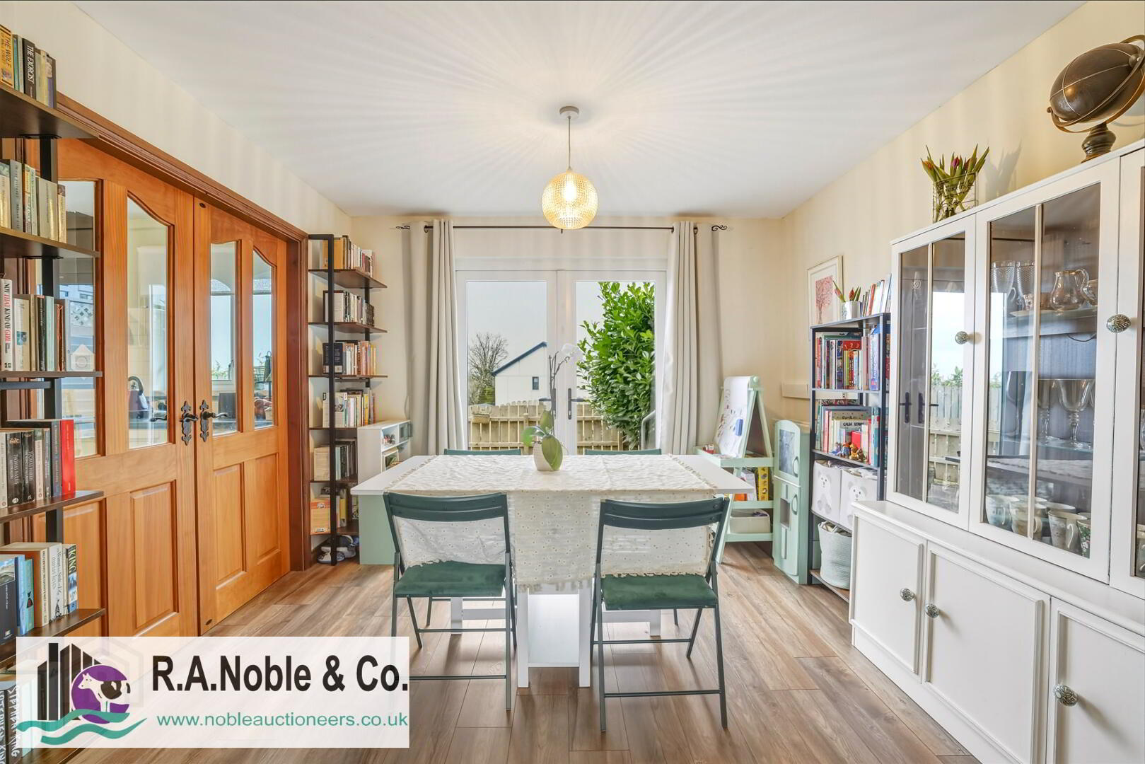 Double doors from the dining area lead into the kitchen, which is well equipped with an electric hob, extractor fan, dishwasher, and a stylish vertical radiator.