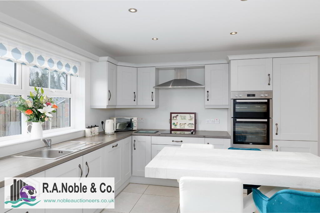Inside the property you will find a cosy sitting room with modern electric fireplace, providing a cosy focal point for relaxation. The spacious kitchen is designed with both functionality and style in mind, boasting a double oven, electric hob, built-in-fridge freezer as well as LED spotlights creating a bright and practical cooking space. Additional solid oak doors with chrome handles throughout the home add an extra touch of luxury.