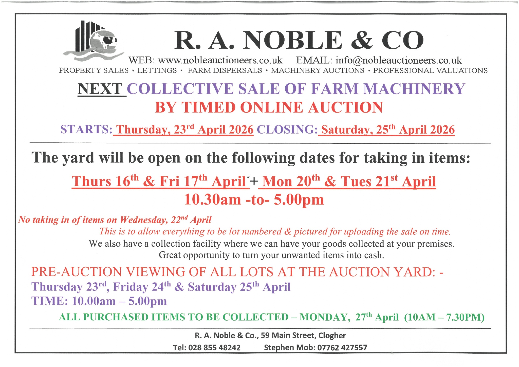 No taking in items on Wednesday, 22nd April. - this is to allow everything to be lot numbered and pictured for uploading the sale on time for Thursday.